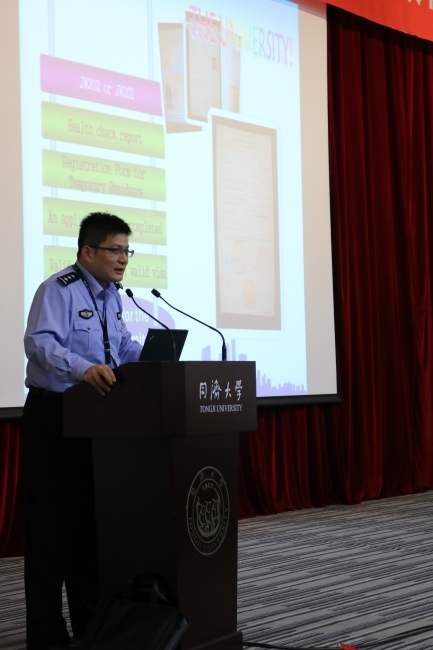 国际学生管理是一项综合服务体系,离不开校内外有关部门的大力支持。上海市出入境管理局警官详尽解读了签证政策、上海市公安局文化保卫分局警官进行了法制宣传、联华国际保险经纪有限公司介绍了综合医疗保险相关情况。主讲人结合具体案例,对留学生关心的各类问题作了具体介绍,对提高留学生的法律意识和安全保障意识起到了重要作用。校保卫处陈丽影老师和留学生服务中心吕钧老师分别就校园安全和宿舍管理条例做了专题介绍,帮助广大留学生们更好地适应同济的生活。留学生老生代表Inesh从学生的视角,介绍了丰富多彩的校园生活和社团活动。现场气氛热烈,新生们表现出极大的参与热情。
