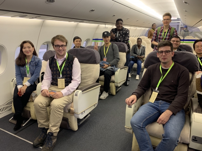 10月20日上午国际学生们参观了被誉为“现代工业之花”和“现代制造业明珠”的中国商飞公司上海飞机设计研究院。商飞工作人员介绍了商飞公司的基本情况和目前商飞的主要机型。随后,国际学生在商飞工作人员的带领下来到综合试验大厅,登上商飞自主研制的C919大型客机展示样机,坐进驾驶舱和客舱,感受中国制造的大型客机的魅力。