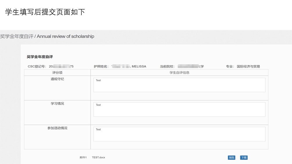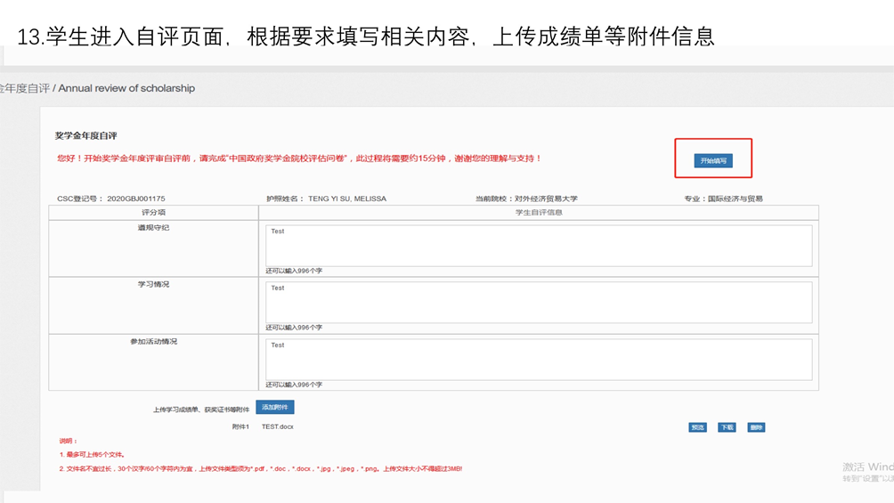 3. 学生进入自评页面,根据要求填写相关内容,上传成绩单等附件信息;