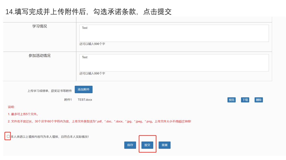 4. 填写完成并上传附件后,勾选承诺条款,点击提交。